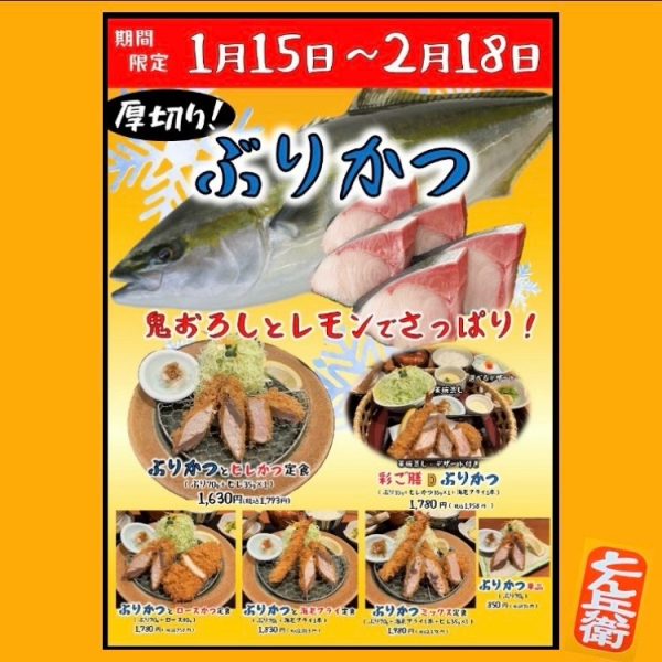 【とん兵衛】厚切り ぶりかつが 1月15日より登場!! 2026-01-07 11:34:12 いつもとん兵衛をご利用いただきありがとうございます厚切り ぶりかつが1月15日より登場!!臭みもなく旨味たっぷり✨お肉だけではなくお魚のフライも美味しいとん兵衛!厚切りな ぶりかつに生姜がきいてるところと大根おろしでさっぱり食べるところが私は好きです!お楽しみに✨そして重ね盛りカキフライは1月14日まで!食べ納めまであとわずかです!ぜひ✨