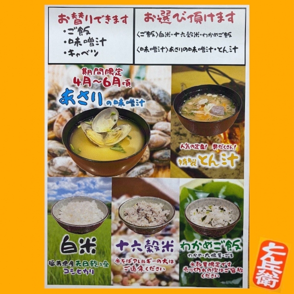 【とん兵衛】ゴールデンウィークのお知らせ 2026-04-24 08:44:25 いつもとん兵衛をご利用いただきありがとうございますもうすぐゴールデンウィークですね✨とん兵衛はゴールデンウィーク中も元気に営業いたします!ランチメニューは祝日・日曜日はお休みで通常通りとなります楽しいゴールデンウィークをお過ごしください✨そして本日より季節限定の味噌汁があさり汁にかわります!ぜひおかわりであさりのみそ汁と豚汁両方楽しんでくださいね!